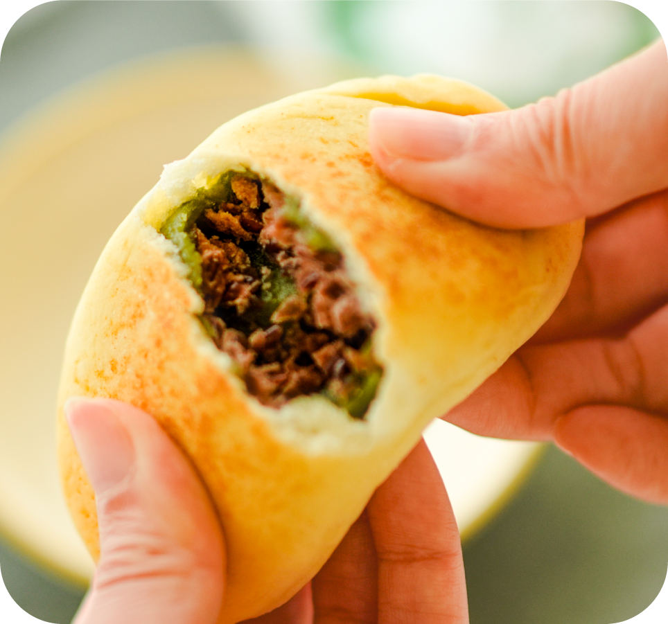笹団子をまるごとパンに包みました。生地に米粉を練り込んでいるから、パン生地からすでにもっちり。生地の伸びがよくなるよう、バター・マーガリンの代わりに米油を使用。米由来のため、笹団子の餅生地と相性が良く、ヨモギの爽やかな風味を堪能できます。