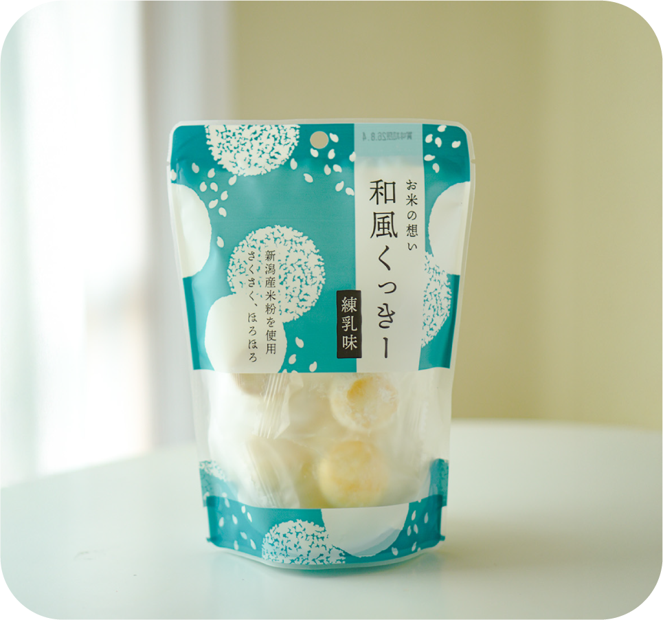 小麦粉と新潟産米粉を使用したさくさく、ほろりと溶ける軽い食感。食べだすと止まらない、やみつきクッキーです。練乳の甘さと粉糖を使った甘味と、ふんわりと上品なお米のやさしい甘さに隠し味の天日塩がアクセント。