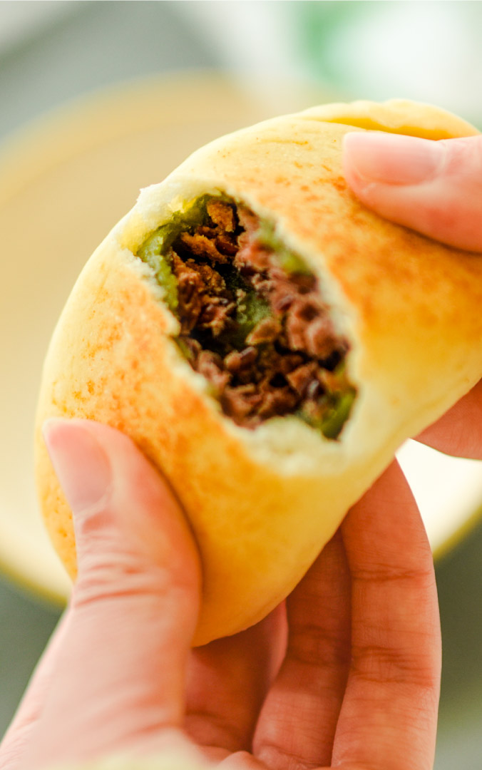 笹団子をまるごとパンに包みました。生地に米粉を練り込んでいるから、パン生地からすでにもっちり。生地の伸びがよくなるよう、バター・マーガリンの代わりに米油を使用。米由来のため、笹団子の餅生地と相性が良く、ヨモギの爽やかな風味を堪能できます。