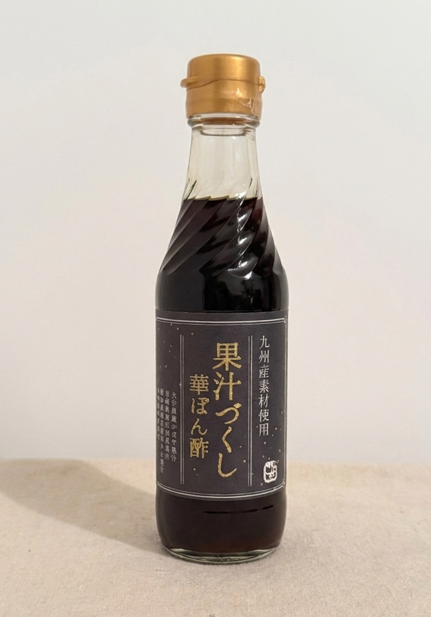 「九州本醸造丸大豆醤油」をベースに、九州各県で取れた柑橘果汁を合わせ、「かつお」と「昆布」で味をととのえたやさしい甘みのあるぽん酢しょうゆです。